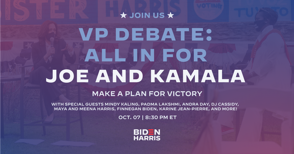 Just before Senator Kamala Harris takes the stage on Wednesday, join us for an exciting pre-debate event with special guests Mindy Kaling, Padma Lakshmi, Andra Day, DJ Cassidy, Maya and Meena Harris, Finnegan Biden, Senator Harris' Chief of Staff Karine Jean-Pierre, and more! We will discuss the historic nature of this debate and share what you can do over the next four weeks to ensure that we send Joe and Kamala to the White House.